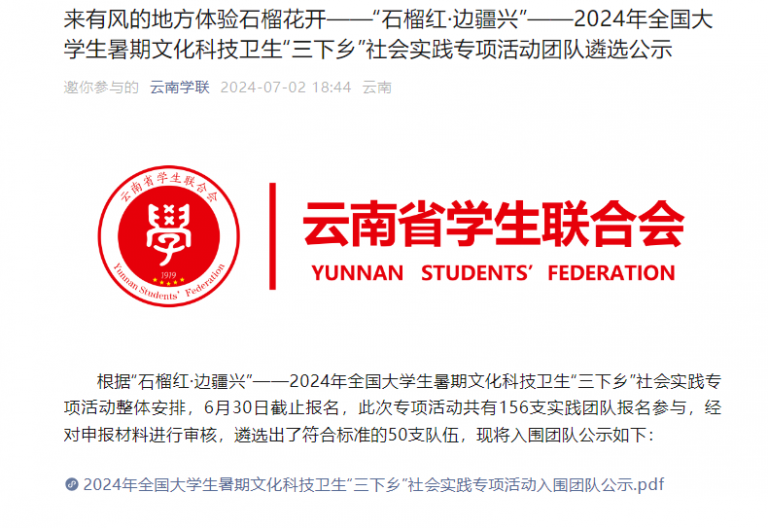 7月2日,共青团云南省委公布了“石榴红 边疆兴”—2024年全国老员工暑期文化科技卫生“三下乡”社会实践专项活动志愿服务队入选名单,yl23455永利(艺术博物馆)“兿树石榴红实践团”在全国156所高校中脱颖而出,成为公司唯一成功入选团队。