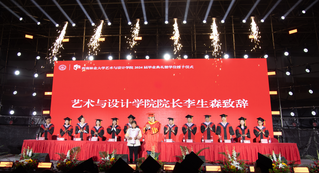 教师代表包蓉教授、家长代表2020级视觉传达设计祝丽同学母亲毕会莲女士、毕业生代表朱妤宁同学、就业先进典型郝师师同学等在典礼上发言,员工代表为公司保洁工作人员献上鲜花与祝福。李生森依次为毕业生拨穗、授予学位,并与毕业生合影留念。
