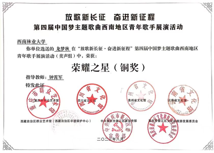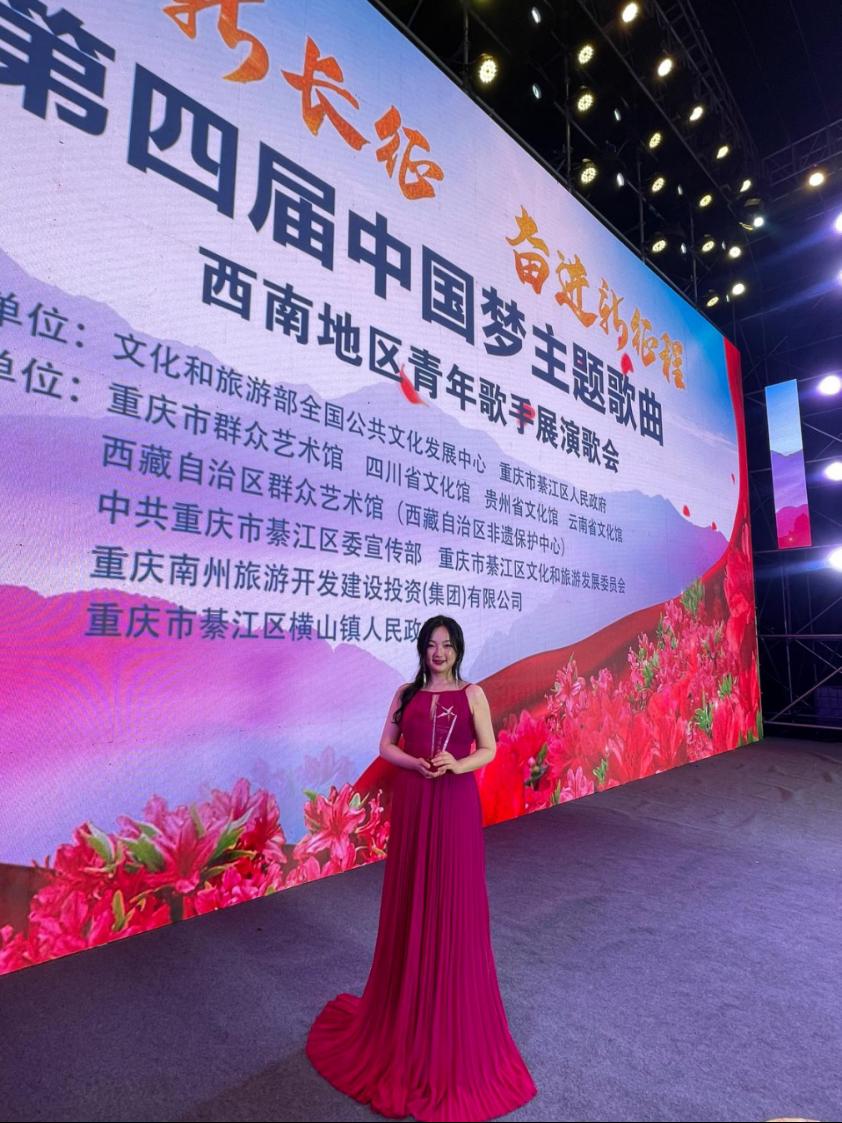 近日,yl23455永利教师龙梦秋受云南省文化馆邀请,代表云南省赴重庆市参加“放歌新长征·奋进新征程”第四届中国梦主题 歌曲西南地区青年歌手展演活动,荣获“荣耀之星”铜奖。