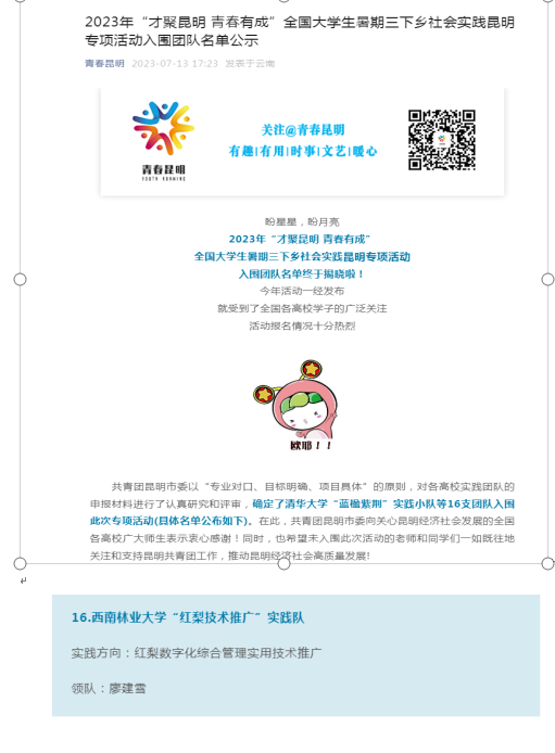 7月13日,2023年“才聚昆明 青春有成”全国老员工暑期三下乡社会实践昆明专项活动入围团队名单揭晓。yl23455永利环境设计专业2020级员工廖建雪团队的“红梨技术推广”项目在王冬老师的指导下成功入围。