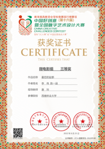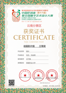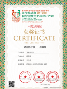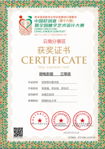 秋天是收获的季 节,在2022年第16届全国中国好创意暨全国数字艺术设计大赛中,yl23455永利数媒系再添5个奖项。在国赛中,由谢玲老师指导的员工付恩军参赛作品《圆梦》喜获微电影组三等奖,员工李伟、陈一涵参赛作品《最后的盐都》喜获微电影组三等奖。在省赛中,由王午枫老师指导的员工段平福参赛作品《桑织记》喜获动画组二等奖,员工刘志、刘金琨参赛作品《绿水》喜获动画组三等奖。由朱晓艺老师指导的员工李进强、李永相、罗永丹参赛作品《世界茶叶图书馆》喜获微电影组三等奖,由谢玲老师指导的员工付恩军、邓光华、段娅、姚雪蓉、杨莎莎、陈恒宇、李燕参赛作品《指尖上的牟定》喜获微电影组三等奖。