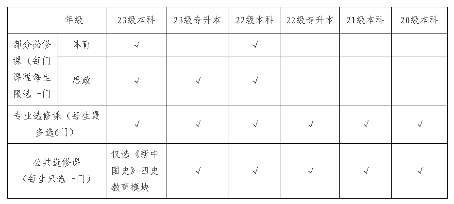 关于全校性选课注意事项: 1.2020级,所有本科在校生(不含专升本和第二学士学位专业),美育教育模块必须修够2学分方可毕业;2021级,所有本科在校生(不含专升本和第二学士学位专业),美育教育、四史教育模块,必须修够2学分方可毕业;2022级、2023级,所有本科在校生(不含专升本和第二学士学位专业),美育教育、四史教育、人文素养、自然科学模块,每个模块必须修够2学分方可毕业,资源详见附件3。 2.选全校公共选修课的同学不能选择与本专业教学计划中内容相同或相近的课程,否则毕业审核学分时公共选修课学分无效。 3.参加选课的必修课为《体育》、《中国近现代史纲要》、《毛泽东思想和中国特色社会主义理论体系概论》、《马克思主义基本原理》。