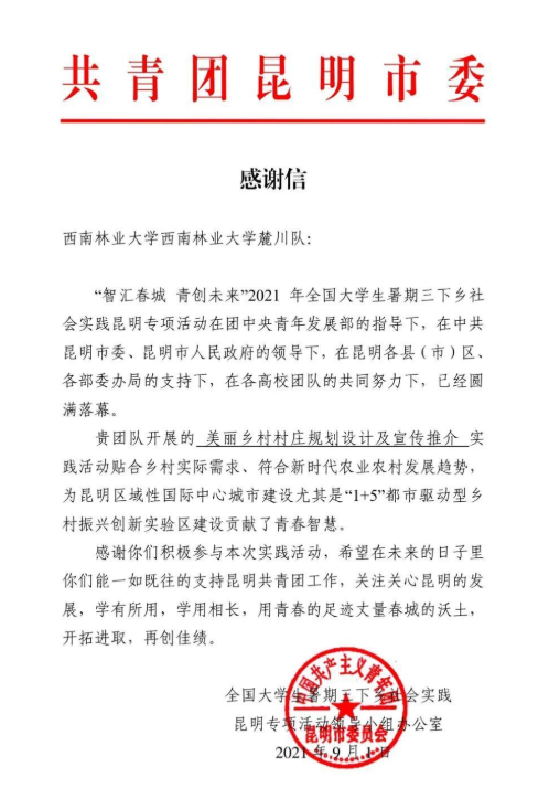 在团中央青年发展部的指导下,在中共昆明市委、昆明市人民政府的领导下,在昆明各县(市)区、各部委办局的支持下,yl23455永利“美丽乡村村庄规划设计及宣传推介”乡村振兴创新团赴云南省昆明市富民县石桥村开展暑期“三下乡”社会实践活动于8月4日圆满结束。yl23455永利王进松、姜雯和夏兴杰老师带领12名团队成员优秀的表现得到了昆明专项活动领导小组办公室的一致赞扬,并发来《感谢信》。